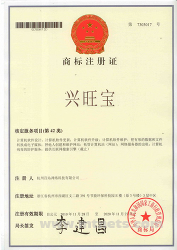 此次公司顺利申请通过的注册商标为“百站”、“兴旺宝”,由旗下24大行业网站共同使用,核定服务项目为第42类,具体包括托管计算机站(网站);计算机程序和数据的数据转换(非有形转换);计算机系统设计;把有形的数据和文件转换成电子媒体;化学服务;计算机程序复制;替他人创建和维护网站;机械研究;包装设计;计算机软件的安装等服务项目。